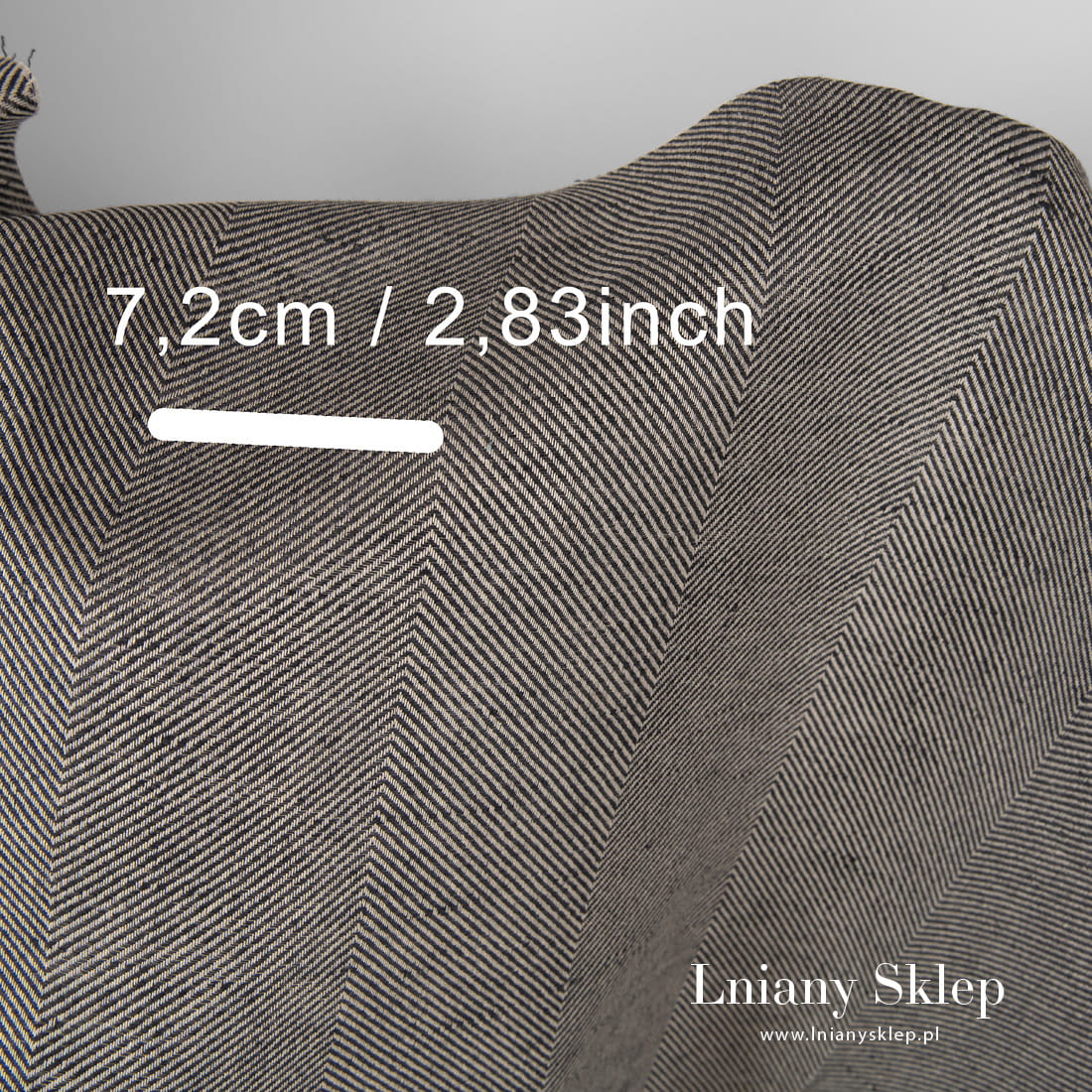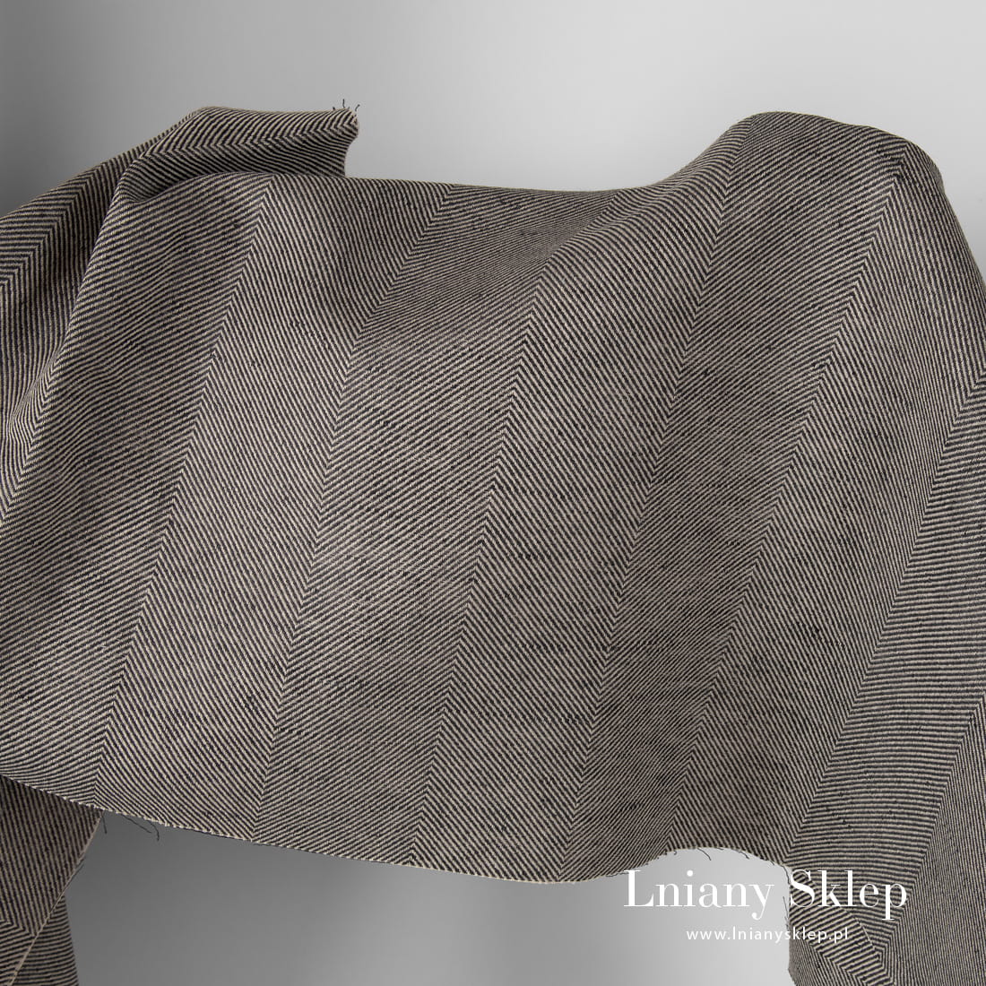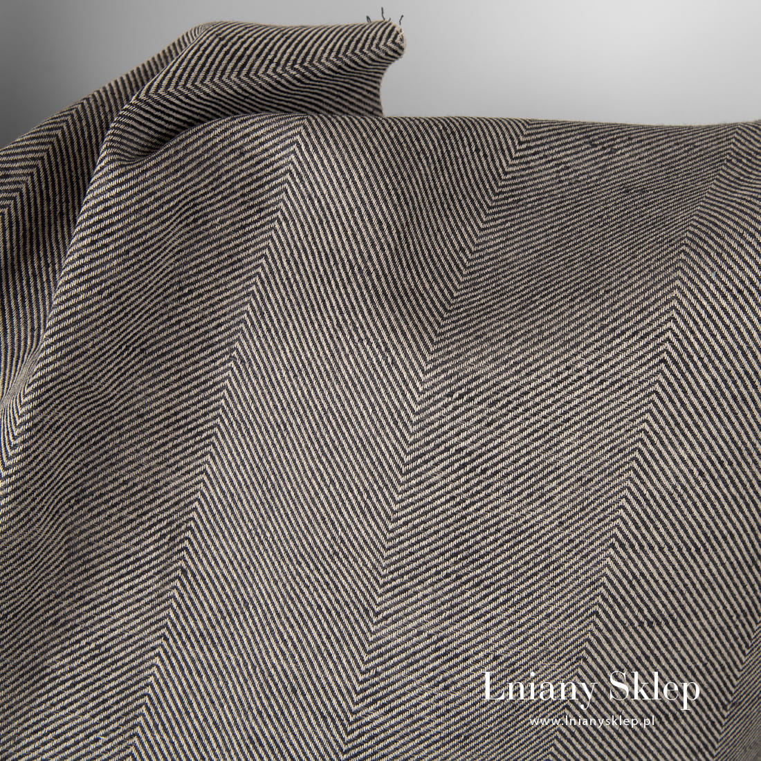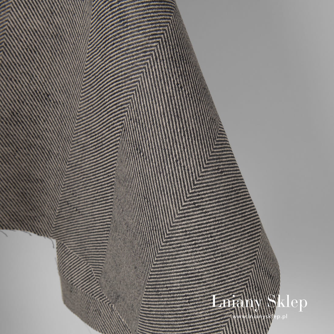 Tkanina w szary wzór jodełkowy wytkany z przędzy ciemnoszarej i piaskowej. Mocna, gęsto tkana tkanina lniano – bawełniana. Pasuje na szycie odzieży, zasłon, obrusów, narzut na łóżko, poszewek dekoracyjnych itp.