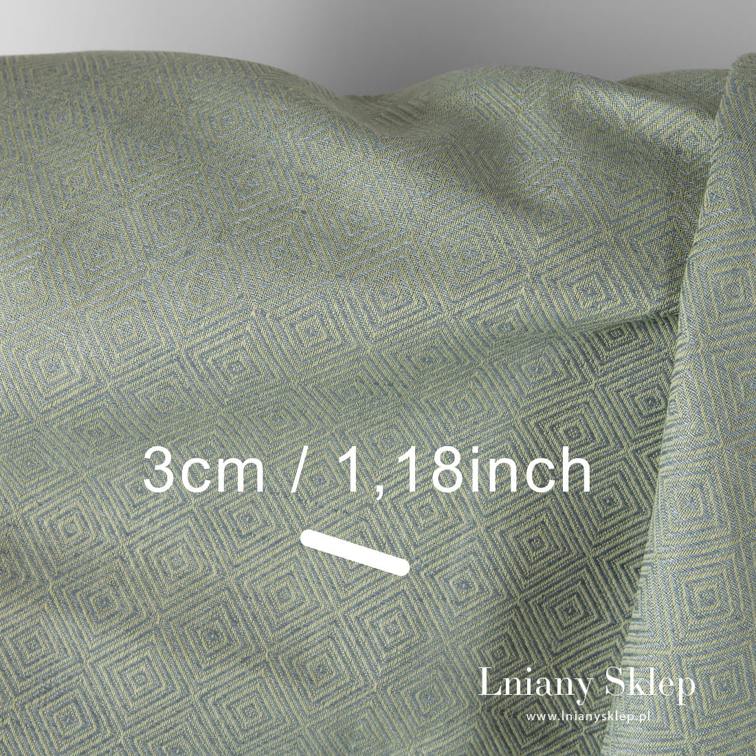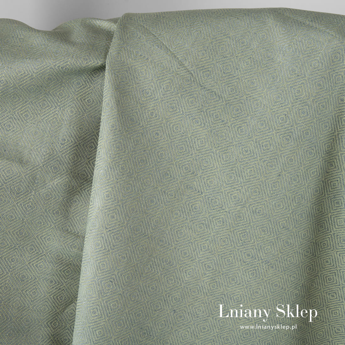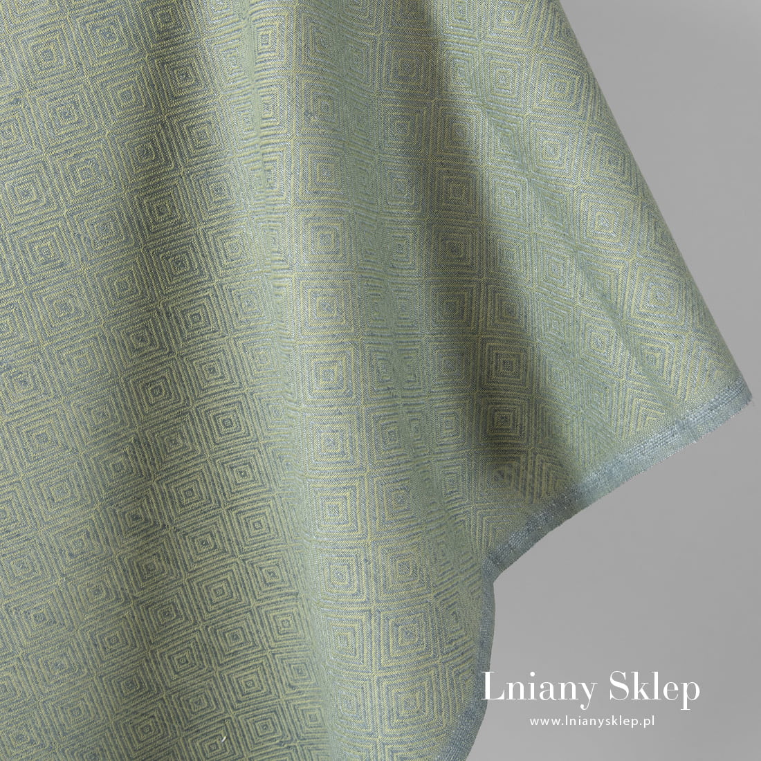 Tkanina w zielone romby wytkana z przędzy jasnozielonej i szarej o niebieskim odcieniu. Mocna, gęsta tkanina lniano – bawełniana na szycie odzieży i tekstyliów domowych.