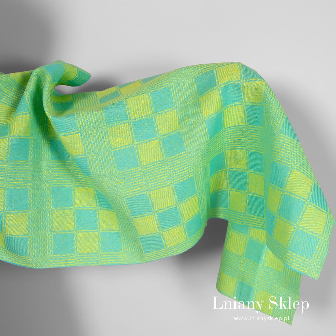 Tkanina w zielono – żółtą kratkę len z bawełną wytkana splotem skośnym z przędzy neonowo żółtej lnianej i jaskrawej zielonej bawełnianej w kratkę. Tkanina średnio ciężka, gęsta na szycie fartuchów kuchennych, obrusów, serwetek i in.