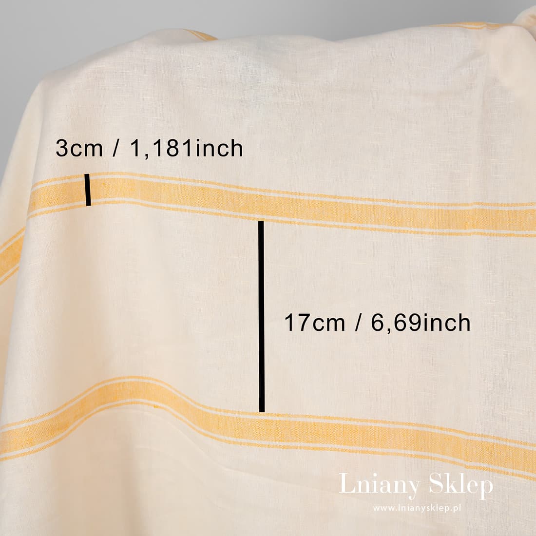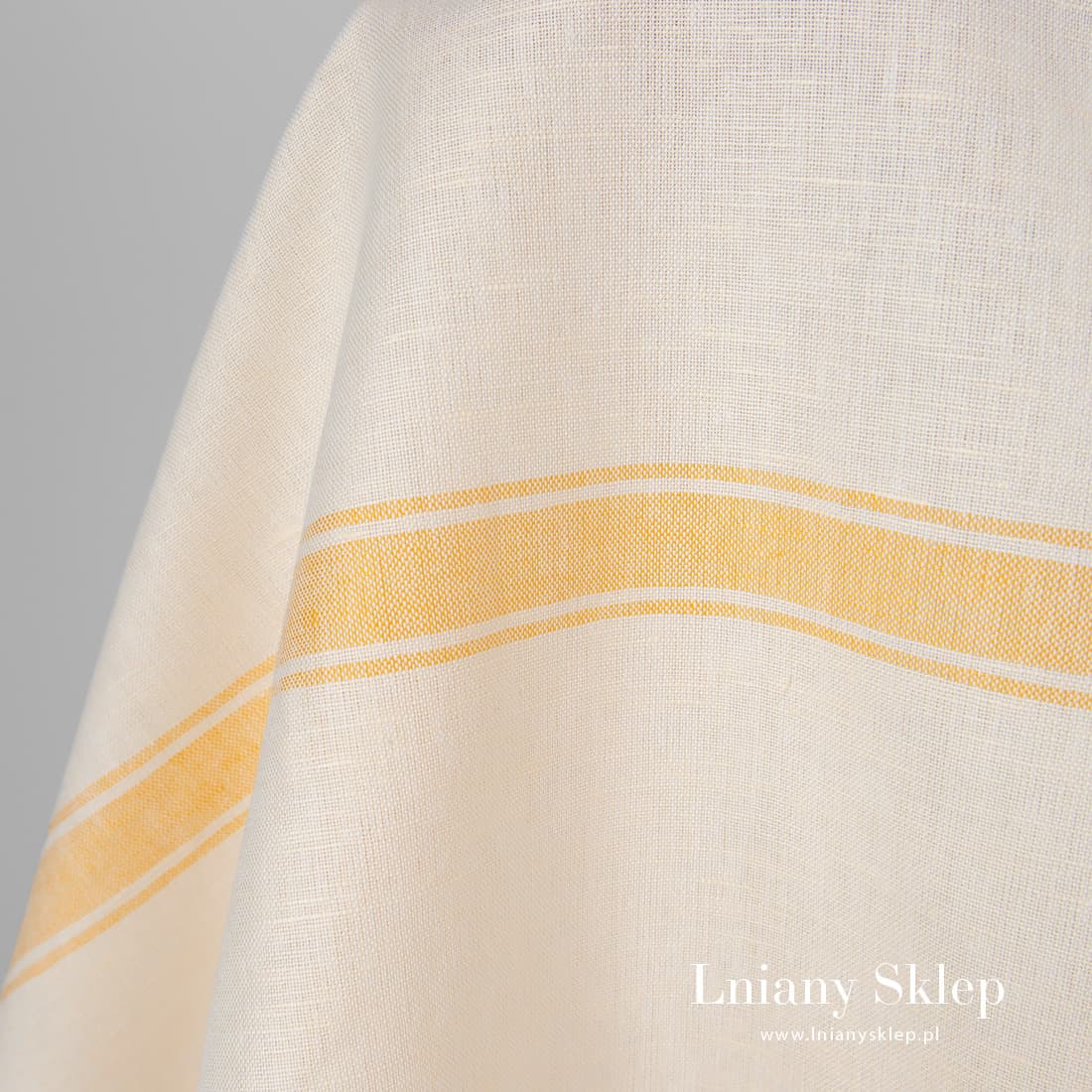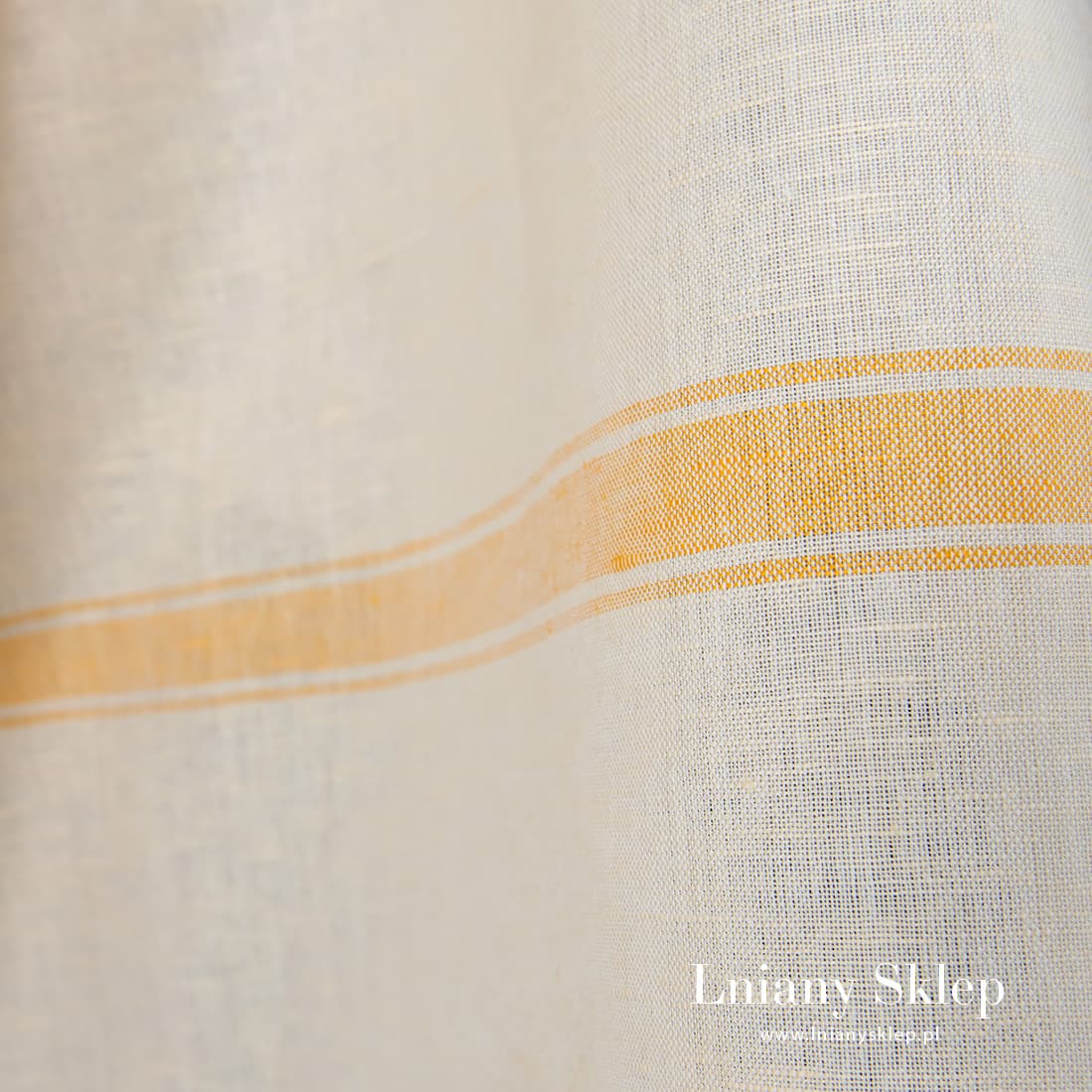 Tkanina żółtawa w piaskowe paski len z bawełną. Jasna, lekko żółta tkanina wytkana została w poziomo biegnące żółte paski. Lekka, mocna tkanina na szycie odzieży i pościeli, zasłon, obrusów.