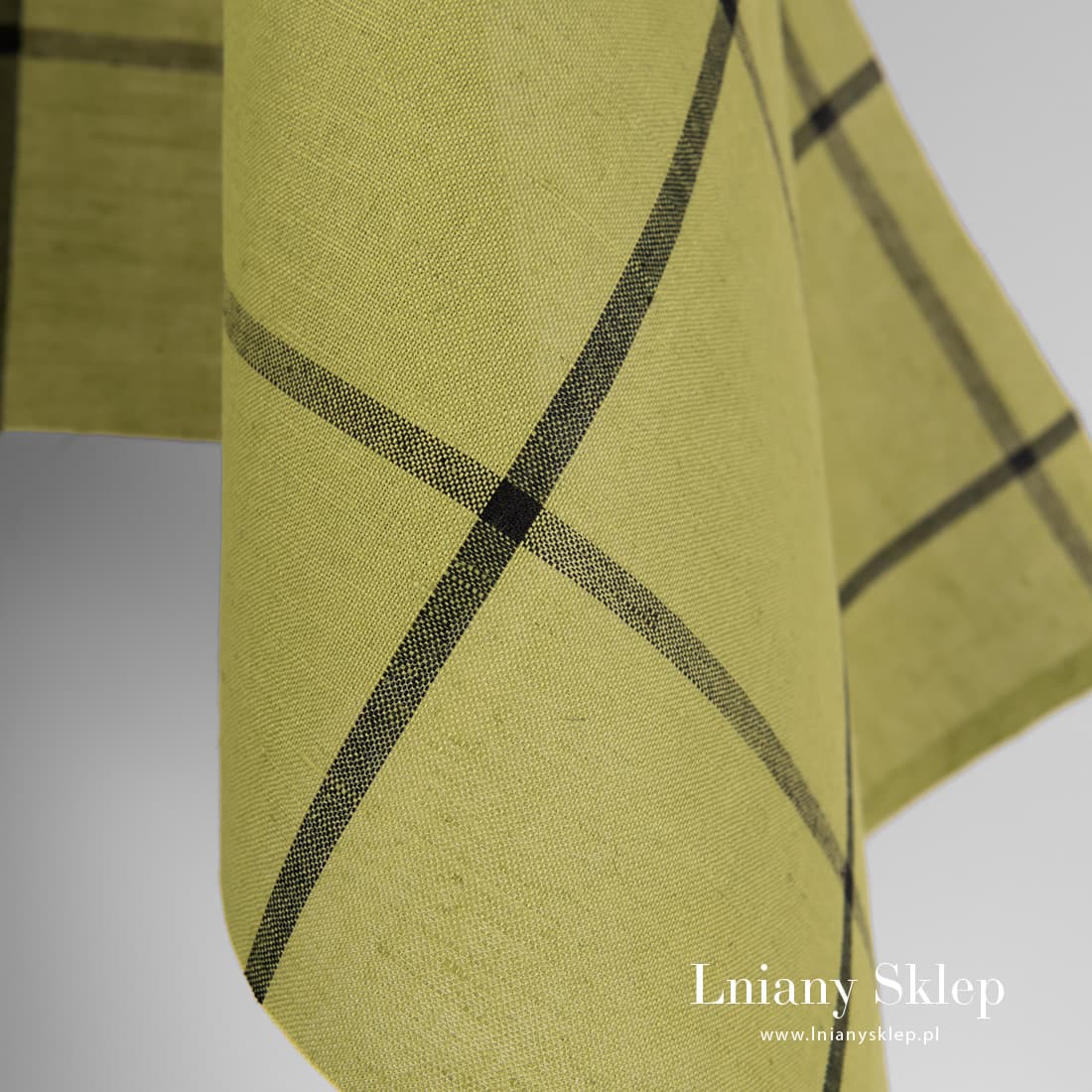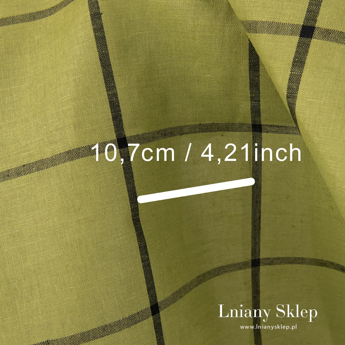 Zielona tkanina w cienką czarną kratkę (10,7cm x 10,7cm). Mocna i gęsta tkanina lniano – bawełniana na szycie odzieży i tekstyliów domowych.