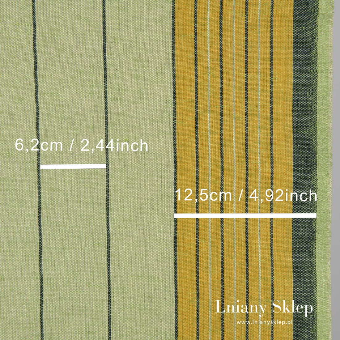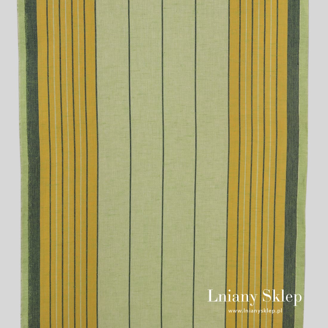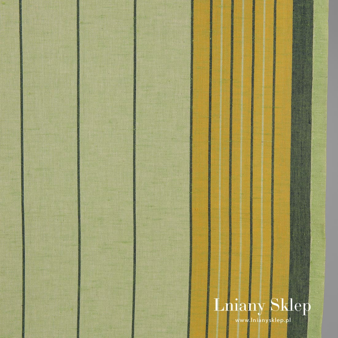 Tkanina lniano - bawełniana wytkana z przędzy zielonkawej (jasnozielonej), granatowej, żółtej i białej w pionowe paski. Gęsto tkana, mocna, średnio ciężka, wytrzymała tkanina idealna na szycie ręczniczków i ścierek kuchennych. Szerokość tkaniny - 50cm.