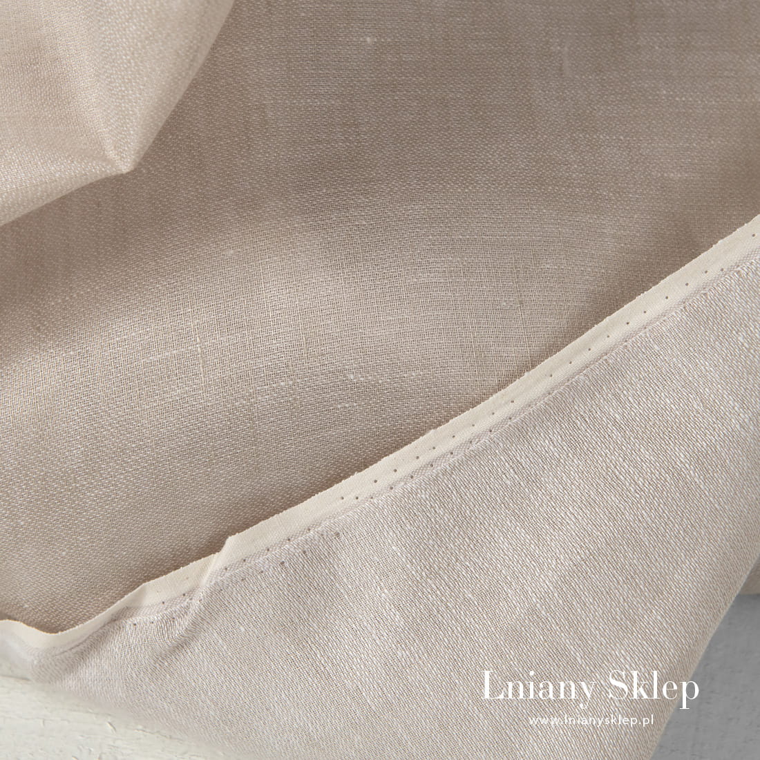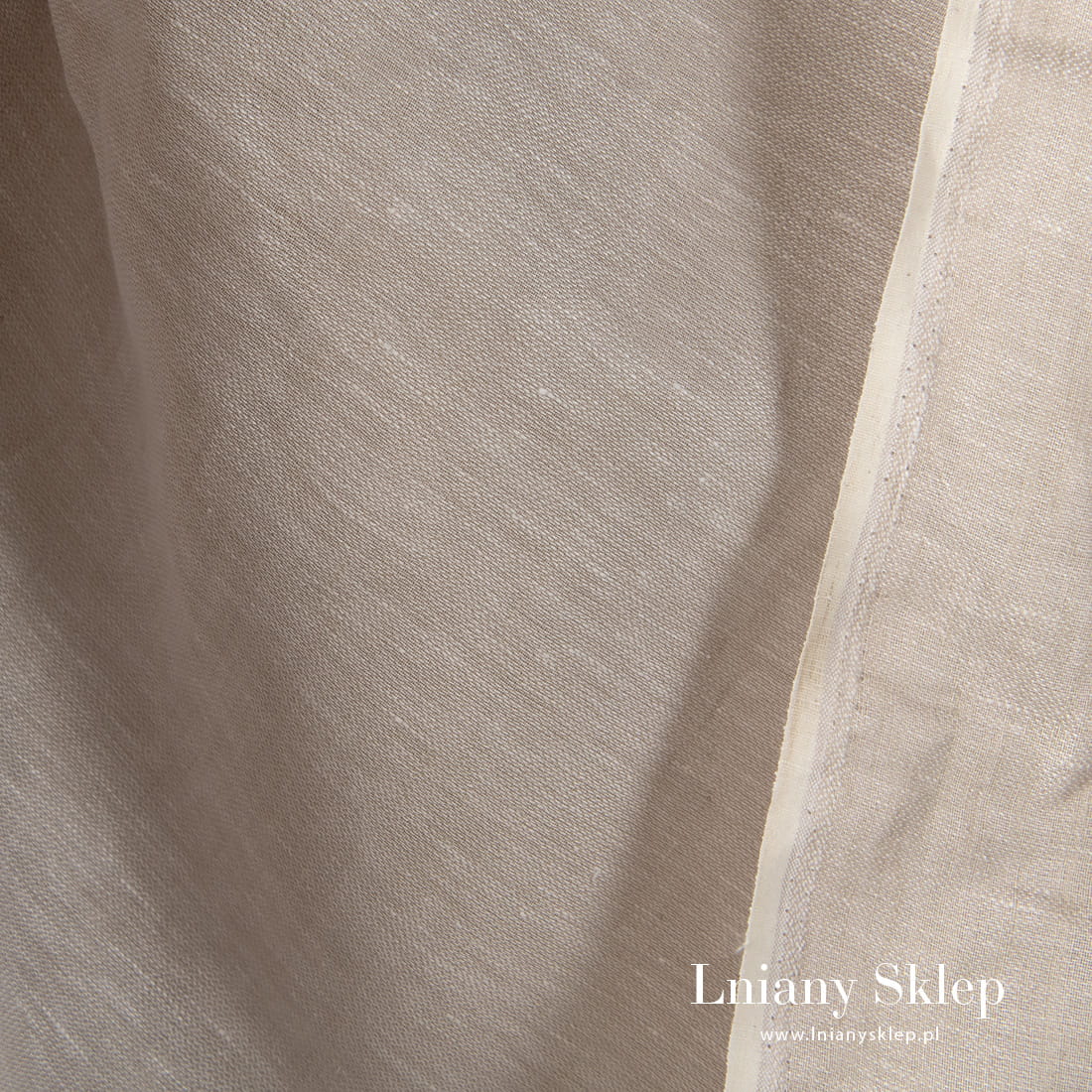 Dwustronny szeroki piaskowy len wytkany melanżowo z przędzy białej i piaskowej o leciutkim szarym odcieniu. Obydwie strony tkaniny dadzą się wykorzystać w projektowanym produkcie. Nieco się różnią: na jednej stronie przeważa biel, na drugiej – kolor lekkiego beżu. Szeroka tkanina lniana – idealna na szycie dużych produktów: zasłon, obrusy, pościel i in.