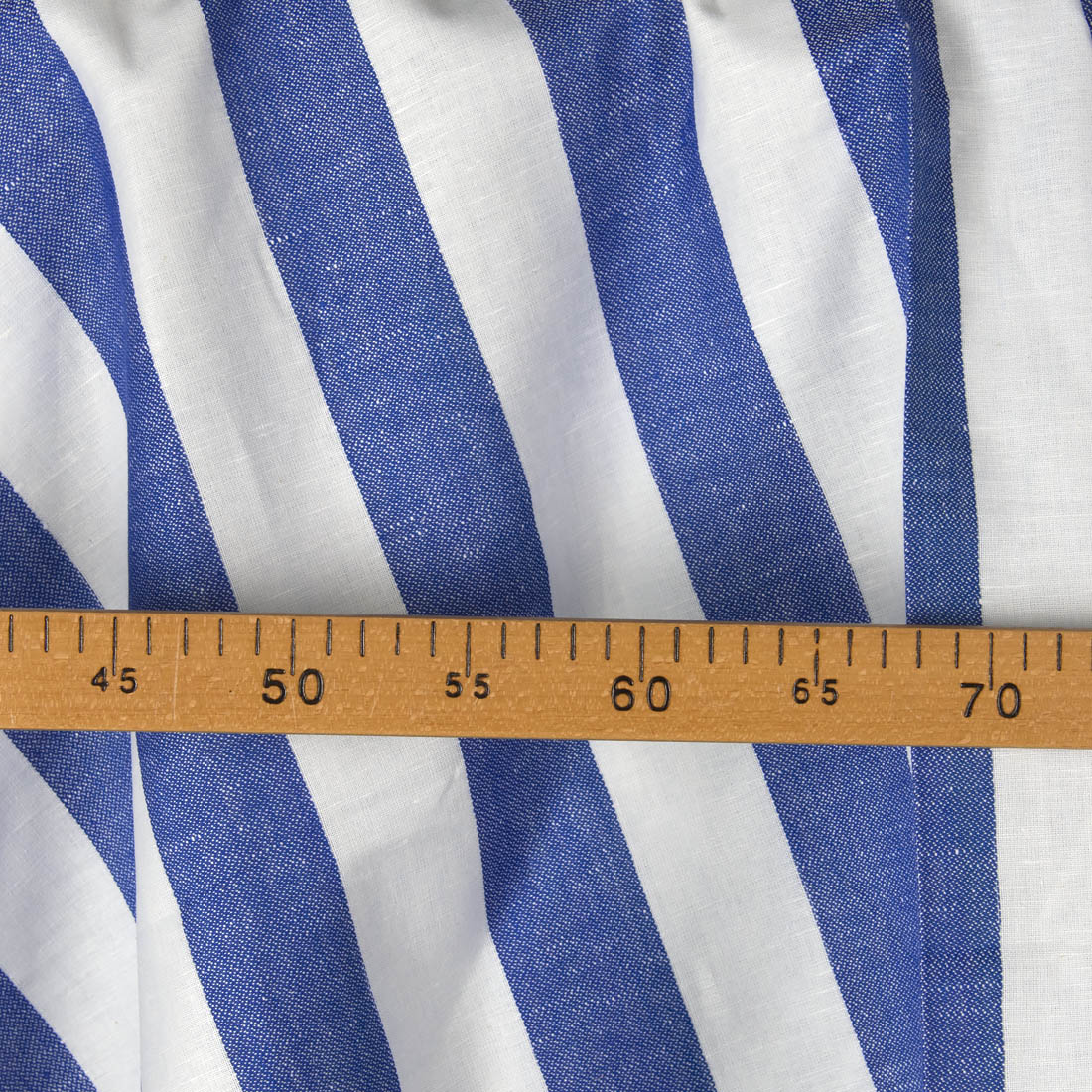 Tkanina lniano – bawełniana w granatowe pasy została wytkana splotem płóciennym w białe, a lekkim wzorkiem w granatowe pasy. Pasy ułożone są pionowo, szerokość każdego wynosi 5 cm. Lekka, ale mocna i wytrzymała tkanina.