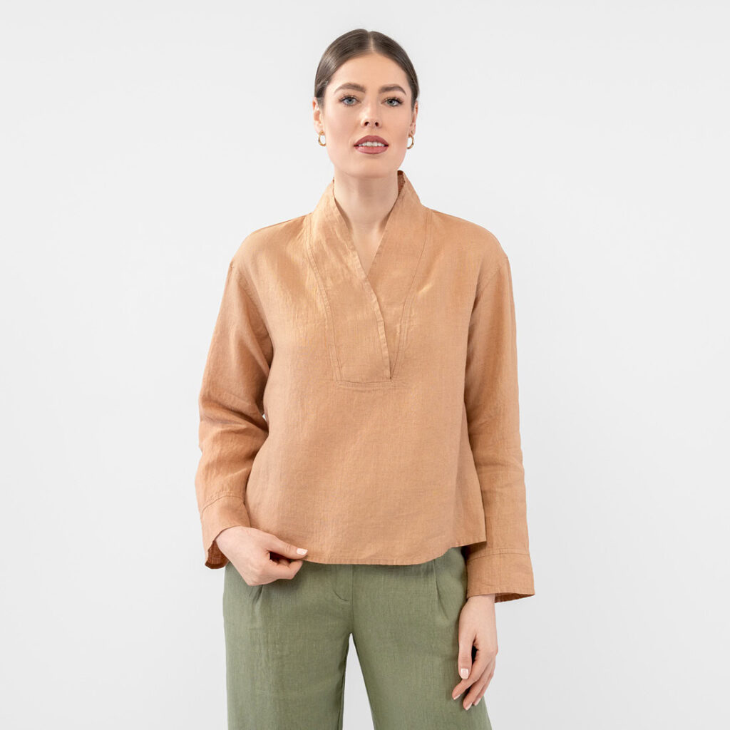 - Szczegóły: szeroka stójka, dekolt w serek, kontrafałda na plecach