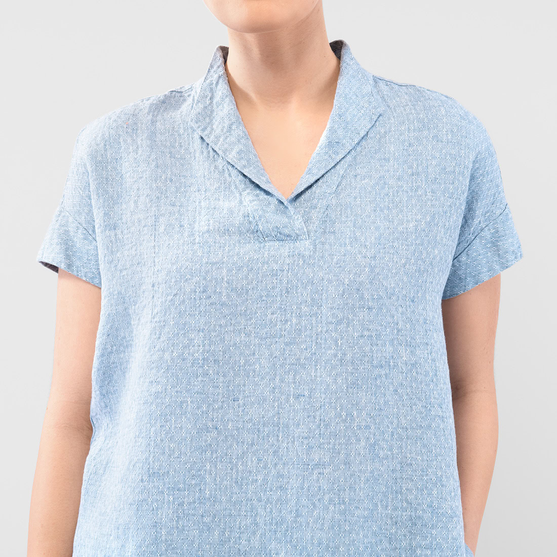 - Model produktu: luźny fason, długość do bioder, krótkie rękawy, dekolt w serek z kołnierzykiem