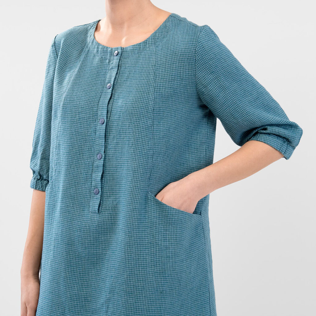 - Szczegóły: okrągły dekolt z częściowym zapięciem na guziki, dwie boczne kieszenie