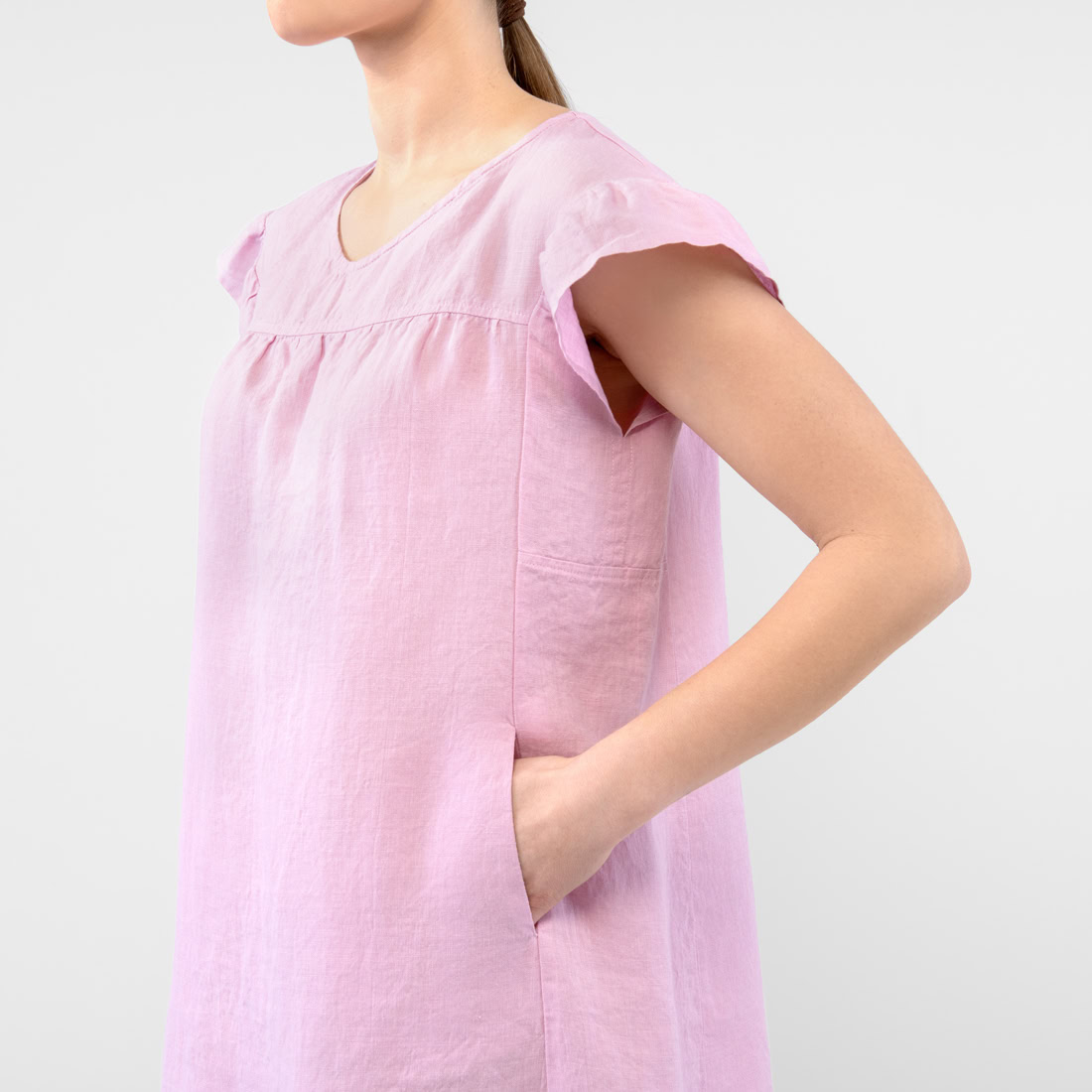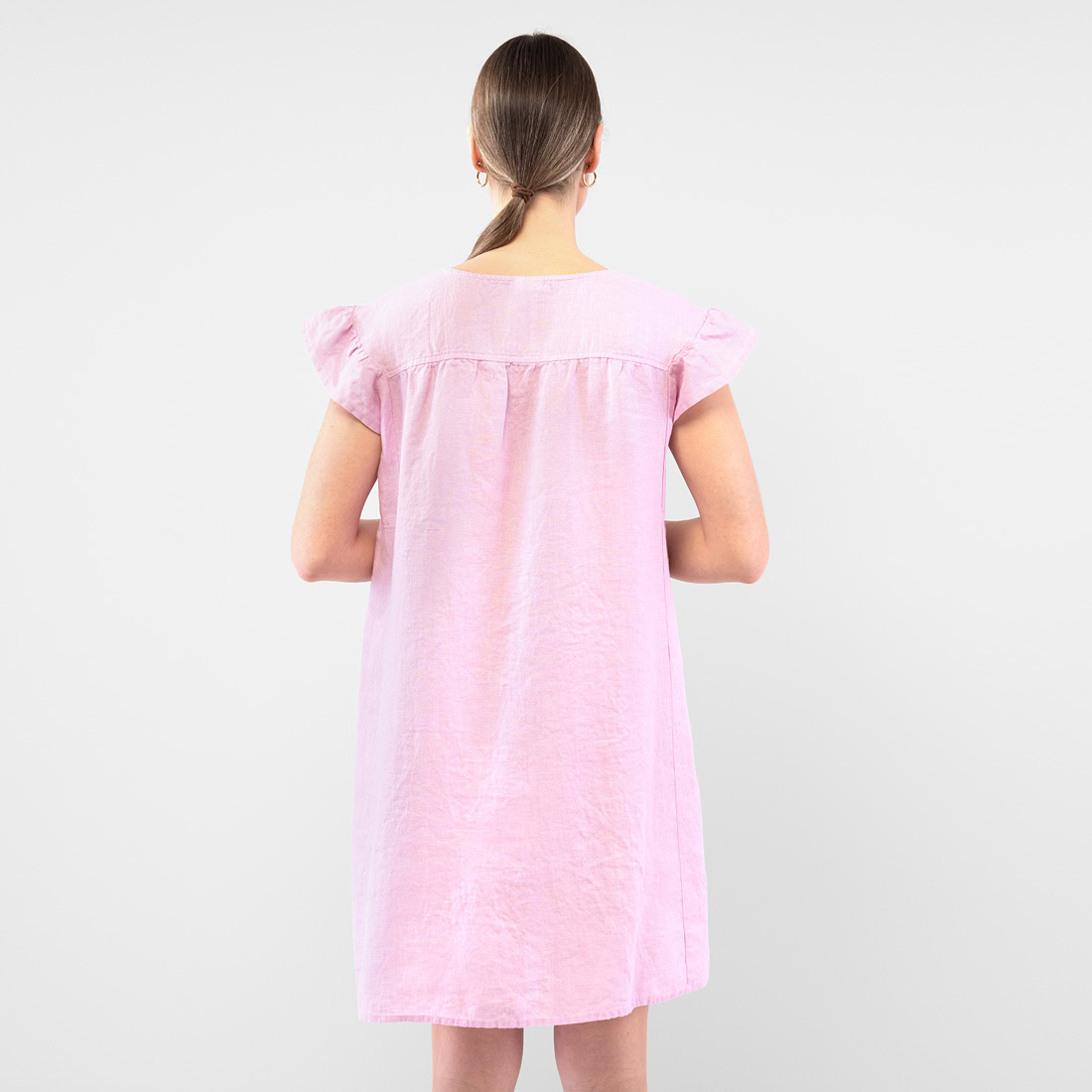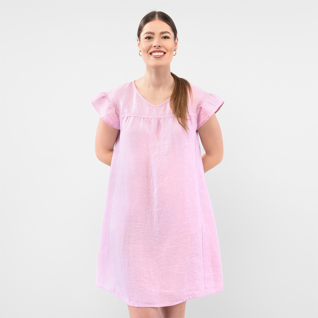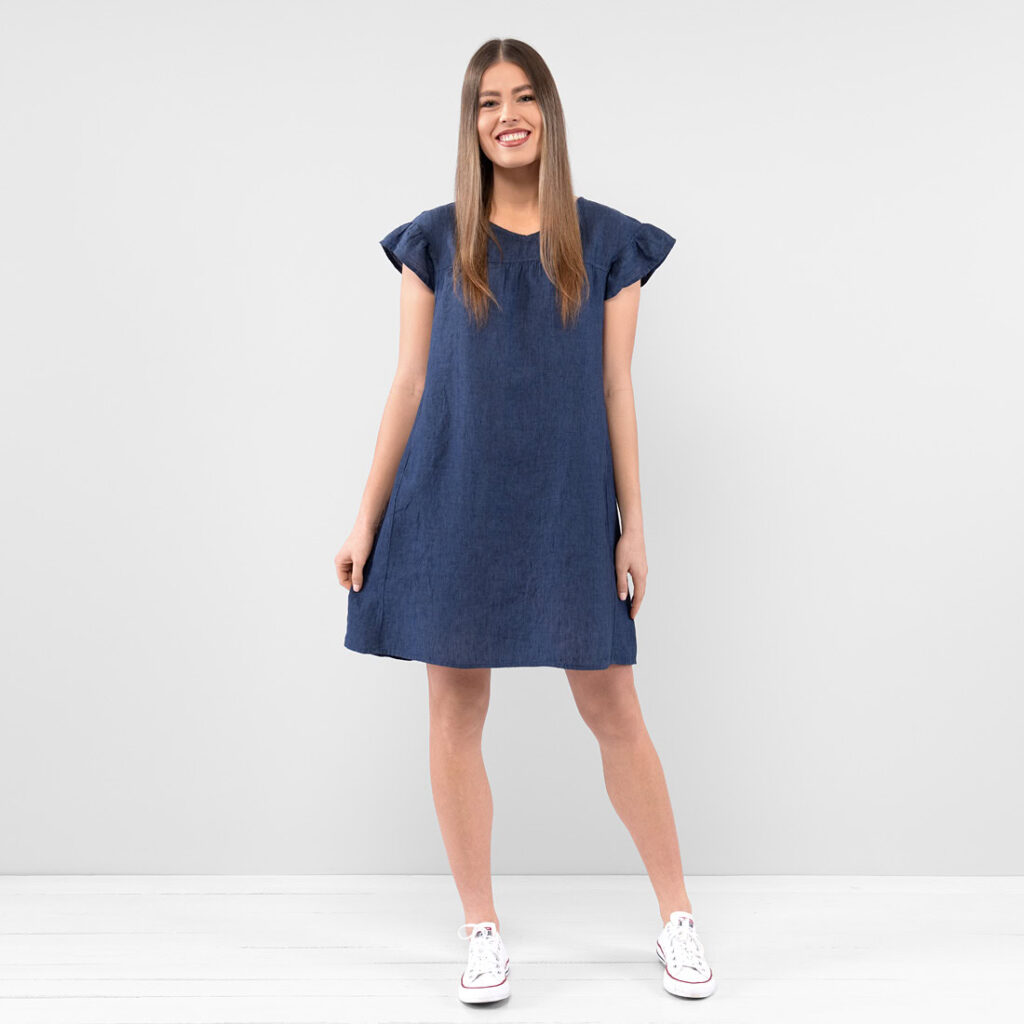 - Model produktu: prosta sylwetka, luźny krój, długość przed kolano, krótkie falbaniaste rękawy