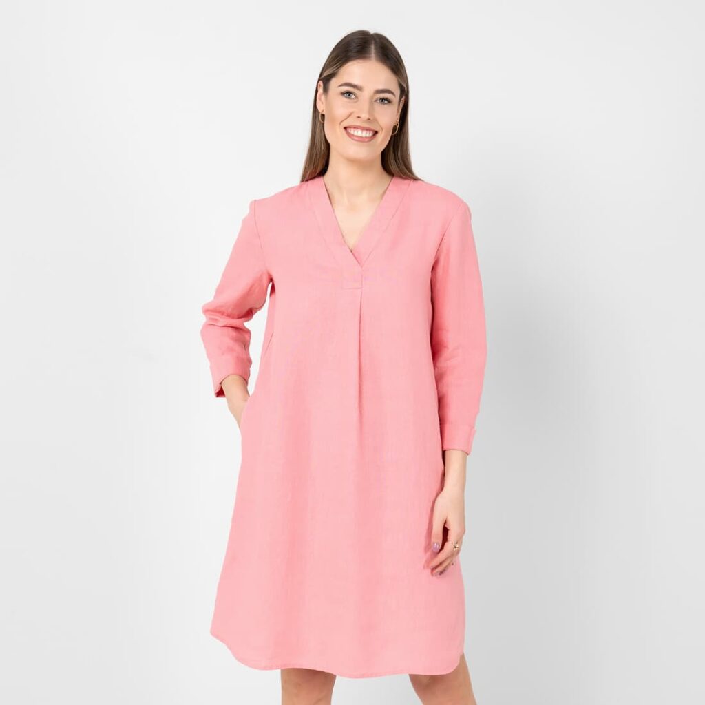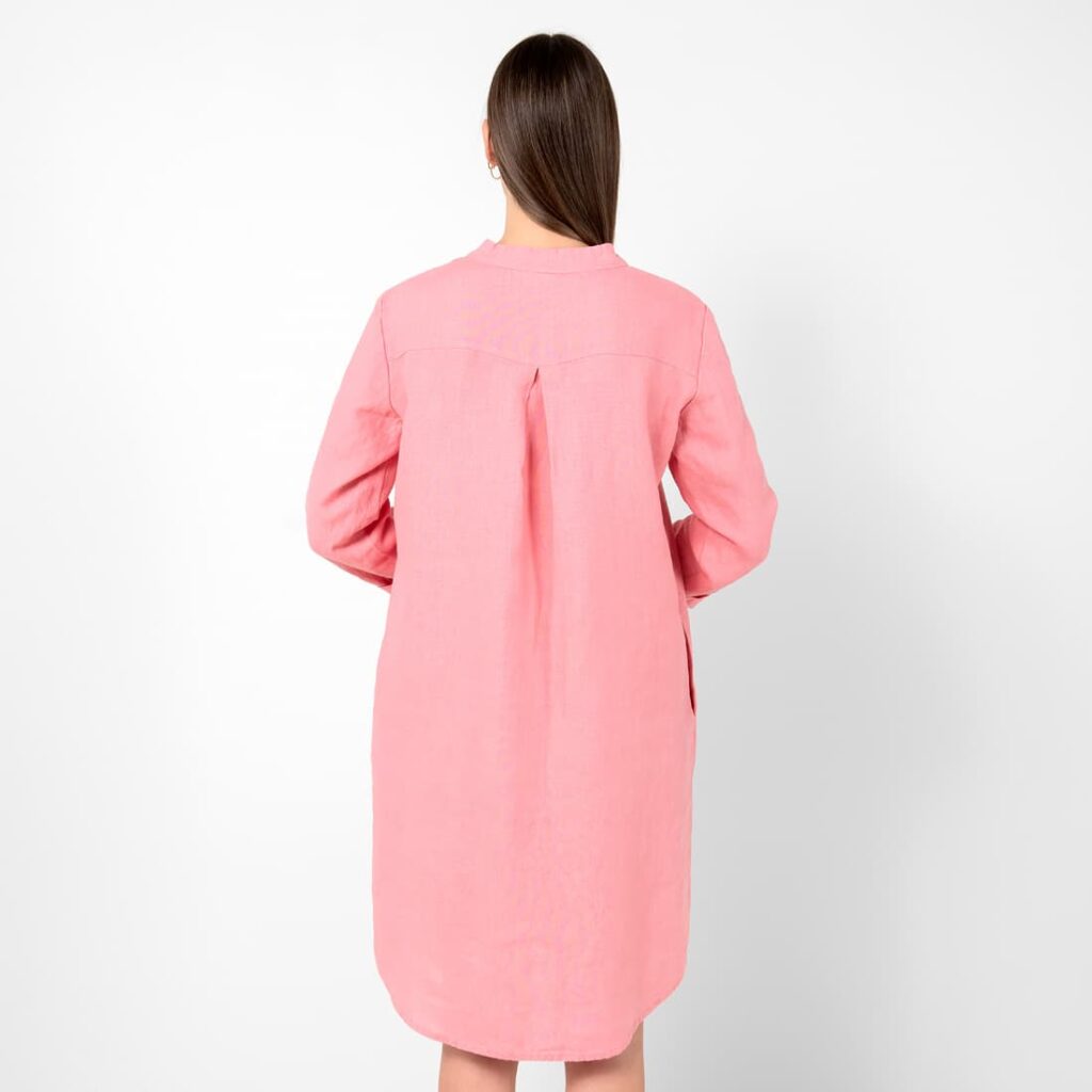 - Model: sukienka koszulowa, rozszerzająca się ku dołowi, długość przed kolana, długi rękaw