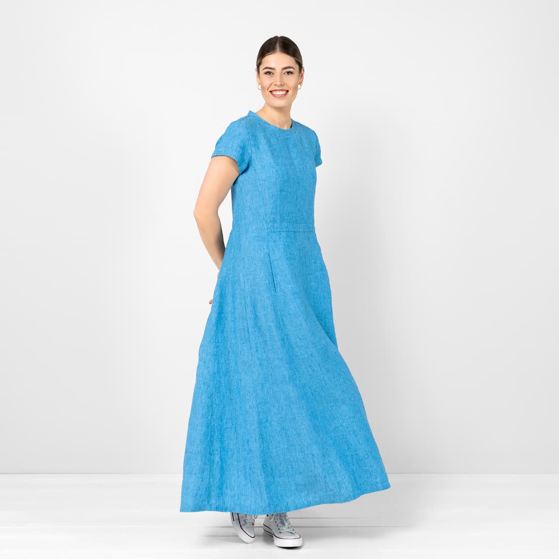 - Model: maxi, lekko rozszerzający się ku dołowi, krótki rękaw
